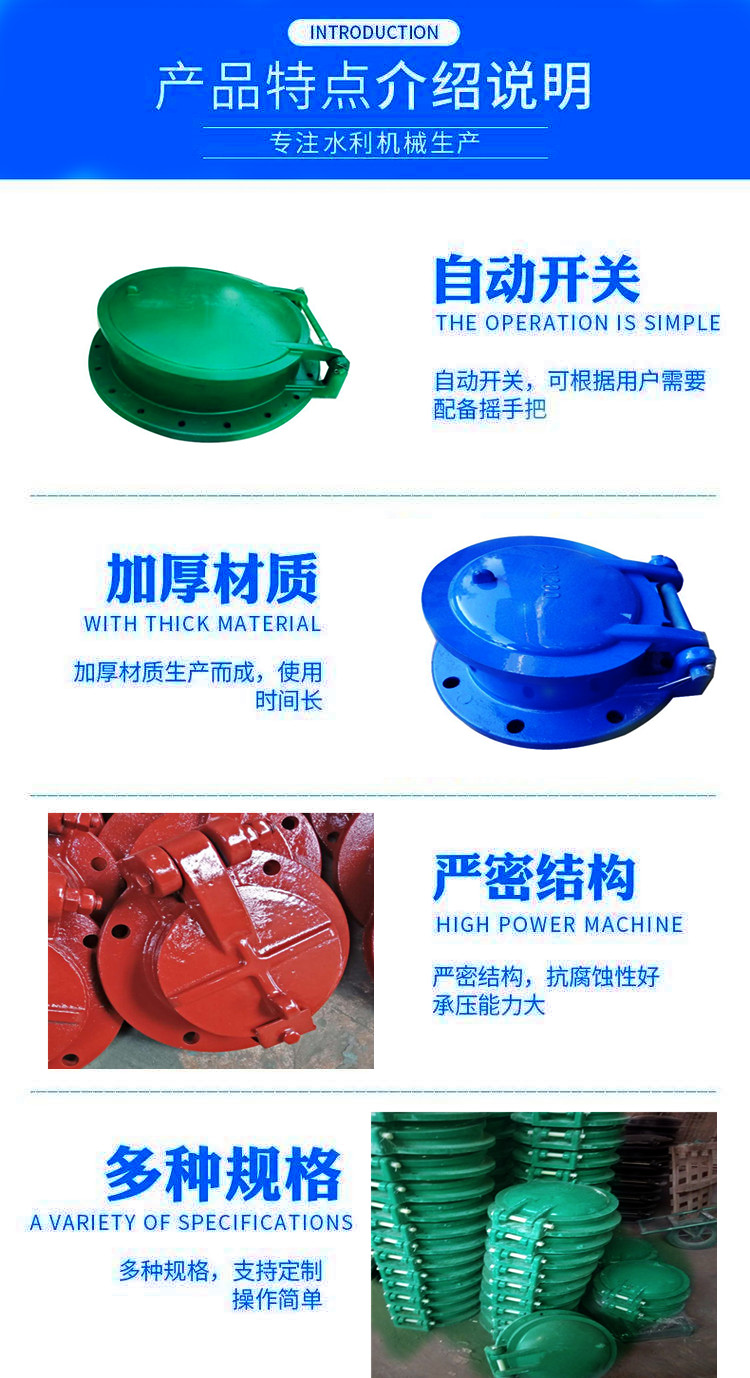 公司生產的拍門有多種材質,鑄鐵的,鋼的,不銹鋼的,玻璃鋼的,復合材料的,根據客戶需要制造,更多了解產品分類目錄有更多產品歡迎采購,訂購熱線13582492022孫經理進行技術溝通指導,洽談。